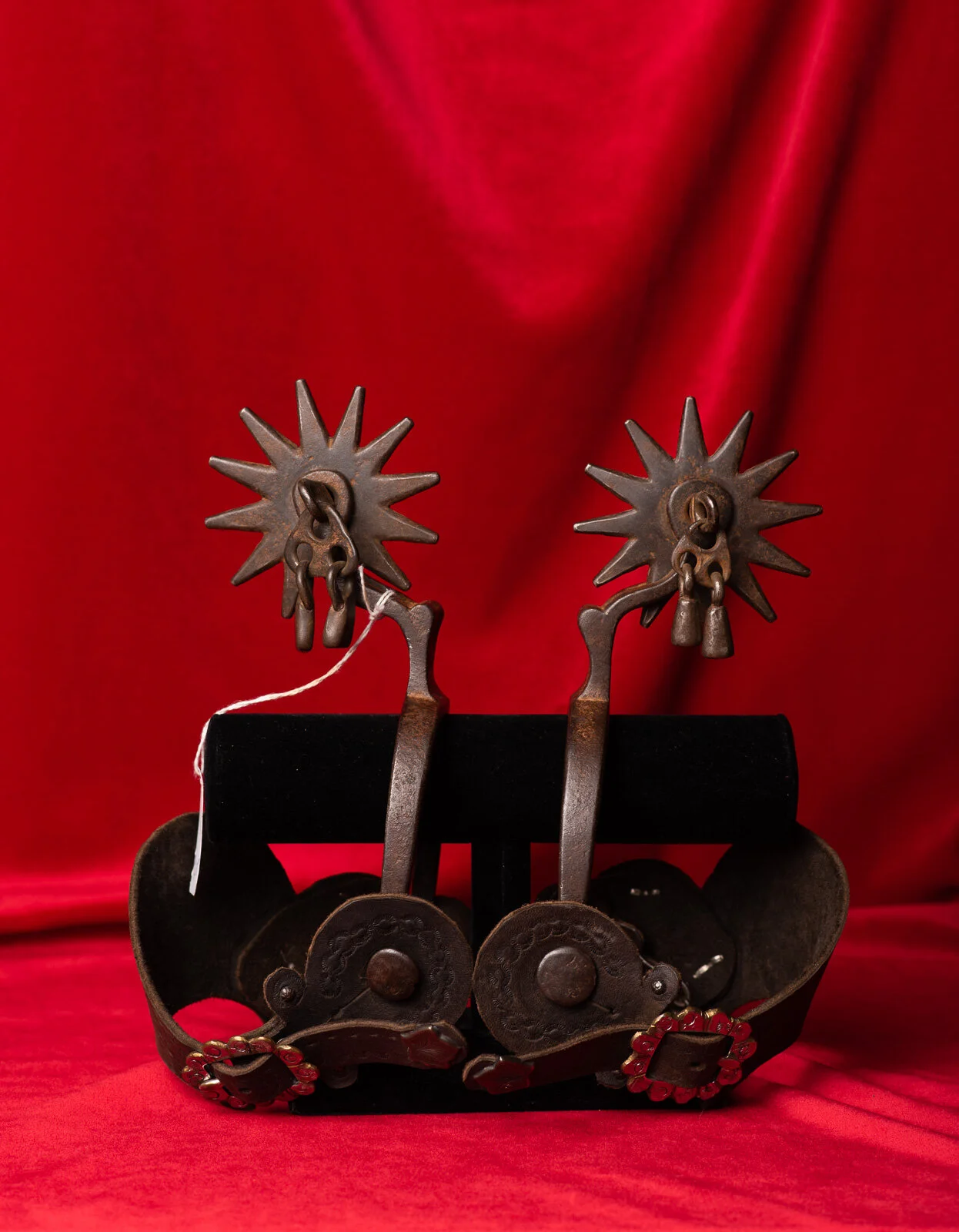 Pair of Mexican transitional spurs with double mounted silver inlay stripes, heel chains and 12 point rowels with pin. Some of the silver stripes show wear and have been chipped off or worn down but overall still shows nicely. Leathers in very good condition with steel hardware and a floral motif.