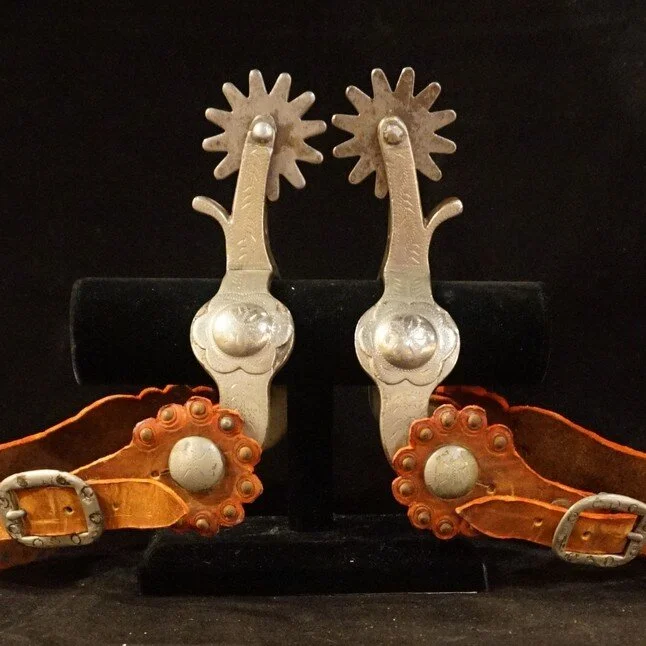 Montana spurs, northwest style. Single mounted silver motifs of diamonds. Chap guard and saw tooth rowels. Nicely tooled leathers with conchas and silver buckles and hardware with diamond motifs.